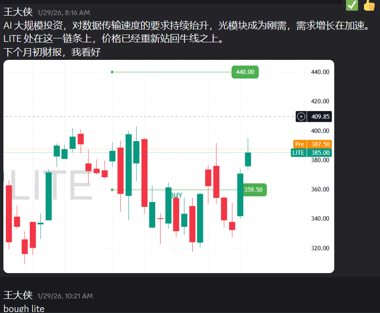 上周我已经在群里提到过 LITE 的买入机会,下周财报我继续看好。