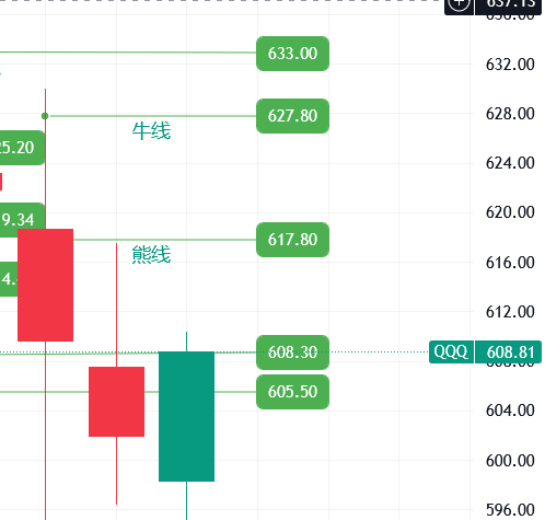只要 QQQ 保持在 605.5 之上,我认为下周至少会有一波反弹,目标先看熊线一带618。