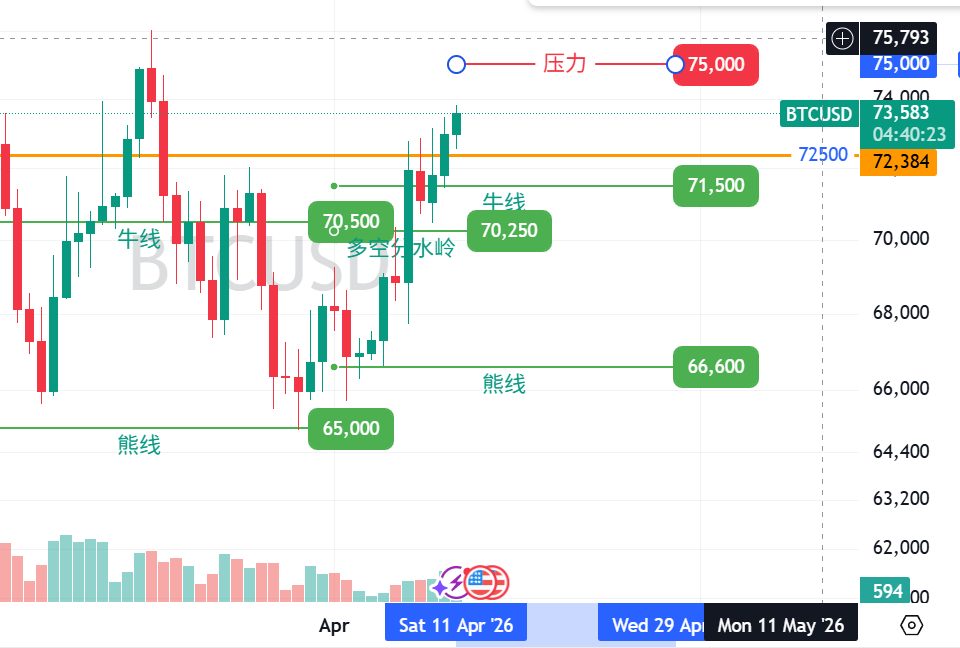 BTC,上周明确表示看涨比特币,也得到了验证。 现在BTC也涨过了牛线,上方压力75k,我认为短期过不去。