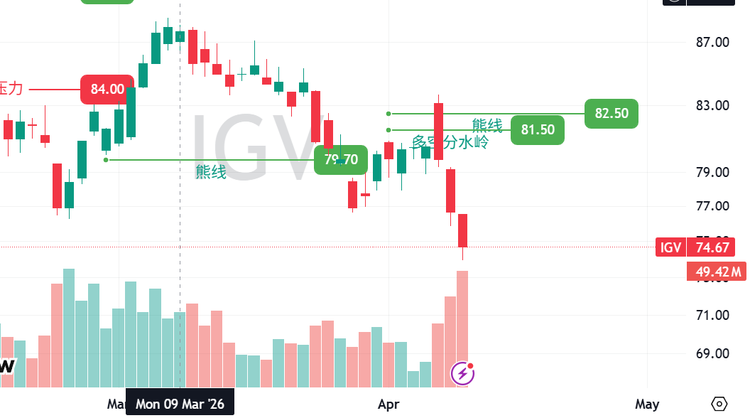 软件IGV, 把三月的反弹全部跌完了,还创了新低。 软件跌的低不是买入的理由。 站不上牛熊分水岭,就没有底的形态, 没有资金在里面沉淀。 就算软件板块超跌反弹,大模型随时可能推出碾压式新功能,这把“达摩克利斯之剑”始终悬在软件上方,市场自然不敢给予高估值。。
