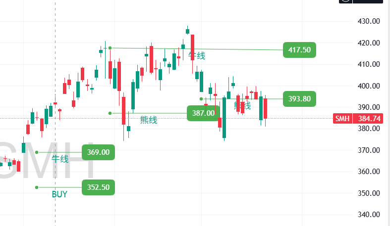 QQQ里面最强的半导体板块也跌破熊线了。 如果站不回393.8,下面就是369. 半导体板块下跌会带动指数继续下跌。