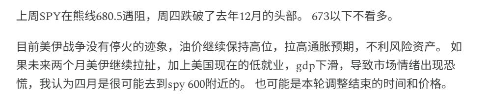 上周spy跌破了去年10月开始的大型头部区间。通常这种长期支撑位的跌破,预示着还有深度调整。 我依然认为spy下个月是可能去到600附近。