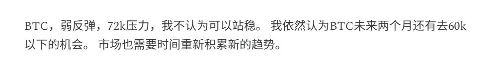 目前BTC的走势很类似去年年底的震荡走势,所以下周反弹到72K以上是降低仓位,加对冲的时机。