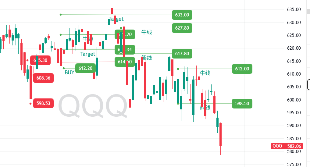 QQQ上周也跌破了熊线598.5. 下周反弹越接近598.5,是加空,加对冲的好时机。