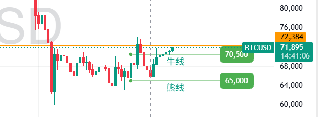 BTC,弱反弹,72k压力,我不认为可以站稳。 我依然认为BTC未来两个月还有去60k以下的机会。 市场也需要时间重新积累新的趋势。