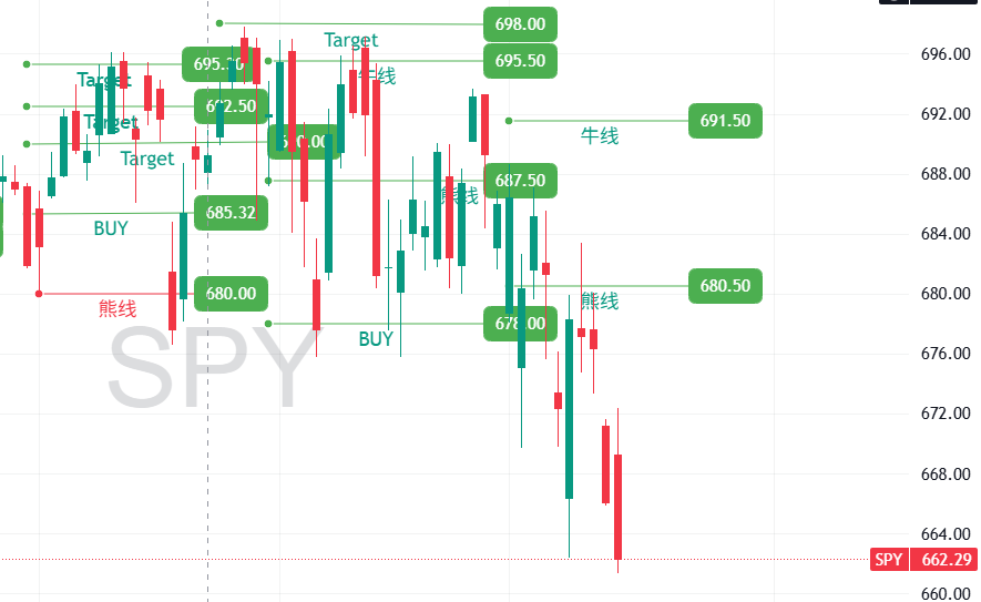 上周SPY在熊线680.5遇阻,周四跌破了去年12月的头部。 673以下不看多。