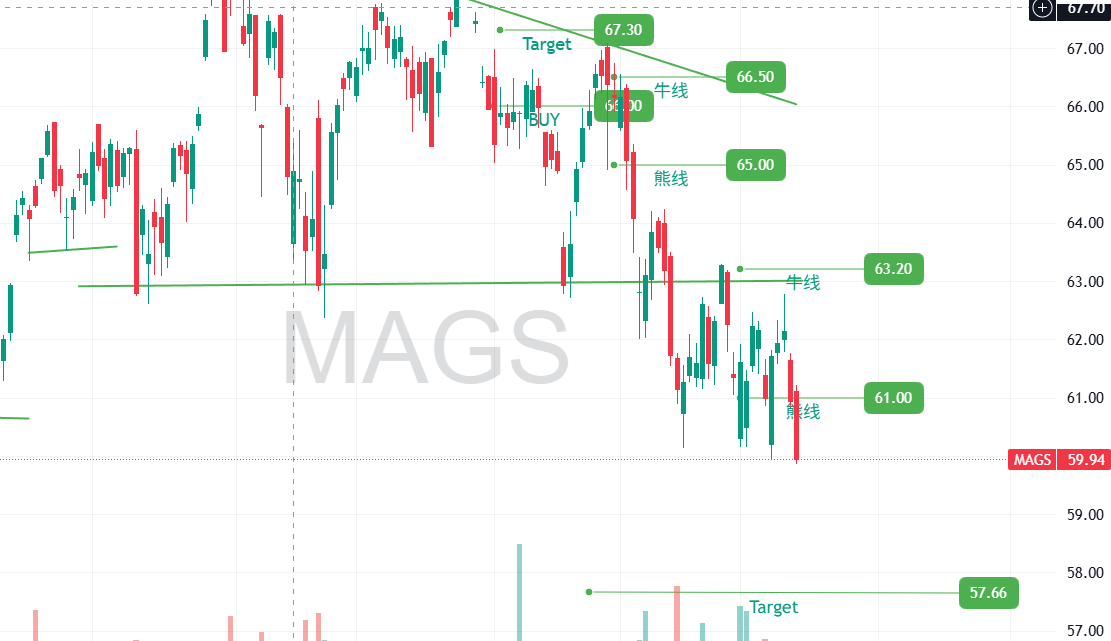 MAGS 大科技指数,周五也跌破了熊线,我认为mags至少要去57.6附近。