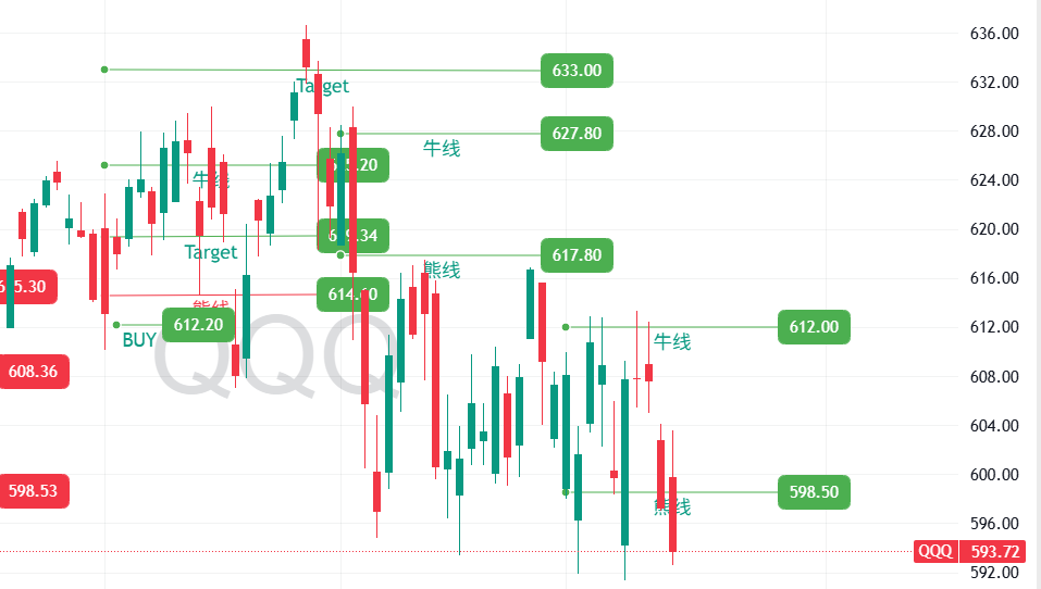 QQQ上周牛线遇阻,周五跌破熊线,下周压力603。